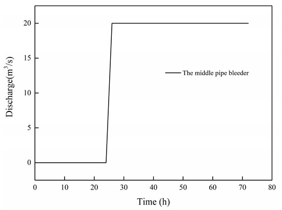 This section introduces the use of a traditional storage compensation algorithm for the large-flow bleeder and the middle pipe bleeder for known water bleeder changes from 0 m3/s to 20 m3/s over a 2 h period in the 24 h. To ensure the stability of the water level in front of the sluice when water diversion occurs, the channel pool can be regulated in advance with the method of storage volume compensation.