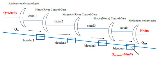 The middle line project is a large-scale water transfer project formed by several channels and pools in series. The middle of each channel pool is connected by a control gate (Figure 2); so, the control gate can be summarized as the inner boundary of the channel pool [22]. The over-gate flow at the inner boundary can be derived from the gate outflow Equation: