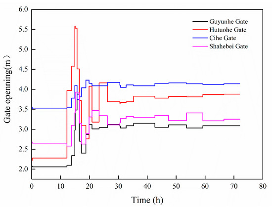 The above formula can be used to obtain the compensation strategy for each section of the canal and pond. The gate regulation period is selected as 2 h. With the water level constraint , the gate overcurrent formula is used to inversely calculate the over-sluice flow for the safe variation of the water level. For details, the reader is referred to Equation (4). According to Equation (17), the flow that needs to be regulated by the gate can be calculated, the amount of gate regulation can be calculated, and the safety regulation can be completed.