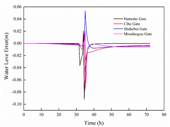 As can be seen from Figure 10, in the case of 20 water discharge adjustments in the middle pipe water distribution, the water level in front of all the series control sluices is affected due to the strong coupling of the series canal pool in the middle line. The middle pipe bleeder is located in the Shahebei Gate–Modaogou Gate control sluice section. It can be seen from Figure 10 that although the water level is finally stabilized in the target water level of the constant water level in front of the gate, the fluctuation phenomenon still occurs in the whole control process. Due to the 20 flow rate changes in the middle pipe head, all the upstream control gate inlet flows are adjusted by 15 flow rates according to the concept of flow balance. According to the adjustment results, although the stability of the water level can be eventually maintained through simple feedforward control, the maximum variation amplitude of the water level in the whole regulation process is 0.3 m, which is far larger than the requirement of the middle line channel pool that the variation amplitude of the water level per hour should not be greater than 0.15 m; so, the feedforward control cannot meet the situational requirements of a large flow water distribution disturbance in the middle line. Therefore, it is necessary to introduce feedback regulation in the conventional water transfer operation.