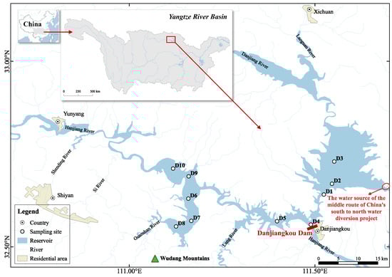 Geographical location and contour map of DJKR, showing the distribution of the sampling sites (D1~D10). The inset map indicates the location of DJKR in the Yangtze River Basin, China.