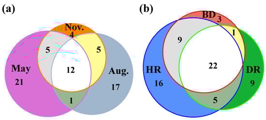 A total of 65 zooplankton taxa were identified in the study, including 28 taxa of Rotifera, 17 taxa of Protozoa, 10 taxa of Cladocera, and 10 taxa of Copepoda (Table S1). The number of taxa found in May, August, and November was 39, 35, and 26, respectively. The number of unique taxa occurring in May, August, and November was 21, 17, and 4, respectively, with 12 shared taxa in all the three sampling periods (Figure 3a). There were 22 taxa shared amongst the sampling areas, and HR possessed a higher total number of taxa as well as unique taxa (Figure 3b). Moreover, the mean taxa number in May (19.86 ± 1.44) was significantly higher than that in November (13.00 ± 1.79) (p = 0.021), whereas there were no apparent differences among the sampling areas (p > 0.05).