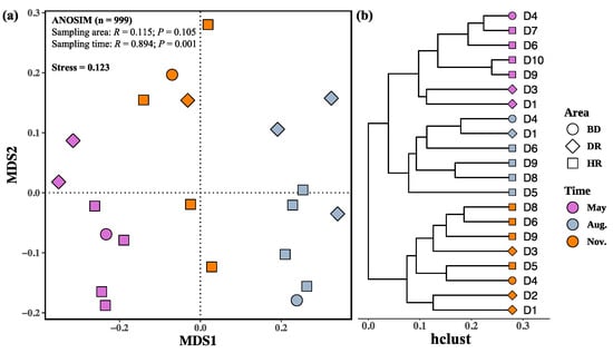 Hierarchical Clustering (hclust, using a “UPGMA” linkage algorithm) and Nonmetric Multidimensional Scaling (NMDS) were conducted to show overall variations in the community composition []. Analysis of Similarities (ANOSIM) was used to test whether the differences were significant []. Furthermore, Permutational Multivariate Analysis of Variance (PERMANOVA) was conducted to analyze variations in the composition of each taxonomic group across different sampling months and areas [], which were further revealed by Principal Coordinate Analysis (PCoA). Similarity Percentage Analysis (SIMPER) was implemented to identify the “responsible taxa” in each group with contributions to the variation > 5% and p < 0.05 [].
