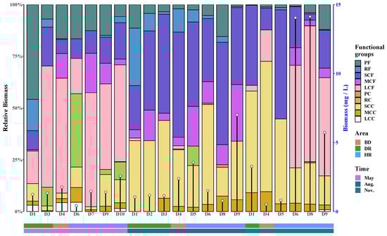 The composition of zooplankton functional groups. The relative biomass of functional groups and total biomass of zooplankton at each site in different sampling months are shown using a stacked histogram (left y-axis) and lollipop chart (right y-axis), respectively. HR: Hanjiang reservoir area, DR: Danjiang reservoir area, BD: the area close to the dam.