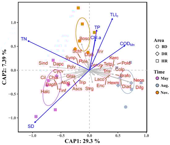 Results of Distance-based redundancy analysis (db-RDA) on the relationship between zooplankton (based on the presence/absence data of all the taxa) and environmental parameters (scaling = 2). Confidence intervals for the sites in different sampling months are represented by the ellipses (confidence level: 0.95). SD: Secchi disk depth, Chl.a: chlorophyll a, TN: total nitrogen, TP: total phosphorus, CODMn: permanganate index. HR: Hanjiang reservoir area, DR: Danjiang reservoir area, BD: the area close to the dam. The full names of taxa codes are listed in Table S1.