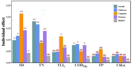 The individual effects of environmental parameters using hierarchical partitioning analysis indicated that among the selected parameters, TN, SD, and CODMn were important and significant explanatory variables for the differences in zooplankton composition based on the presence/absence data of all the taxa, with TN explaining the largest variance (18.07%, Figure 8). When it comes to the four taxonomic groups, consistent orders of importance were only obtained in Cladocera, whereas SD explained most of the variations in Protozoa, Rotifera, and Copepoda. Moreover, TP and Chl.a were always insignificant regardless of the overall analysis or separate analysis.