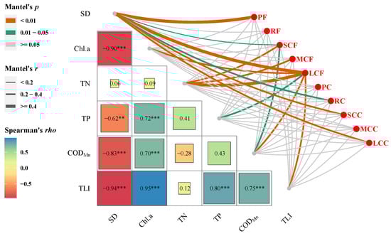 Correlations between functional groups and environmental parameters. The color gradient denotes Spearman’s correlation coefficients between each pair of the environmental factors. The label in each of the squares indicates the specific value of the correlation coefficient (***: p < 0.001, **: p < 0.01). The composition of all functional groups (based on the Euclidean distance of “hellinger” transformed biomass data) was related to each environmental factor (based on the Euclidean distance) by Mantel’s test. Edge width corresponds to the Mantel’s r statistic for the correlation of the two corresponding distance matrices, and edge color indicates the statistical significance based on 999 permutations. SD: Secchi disk depth, Chl.a: chlorophyll a, TN: total nitrogen, TP: total phosphorus, CODMn: permanganate index.