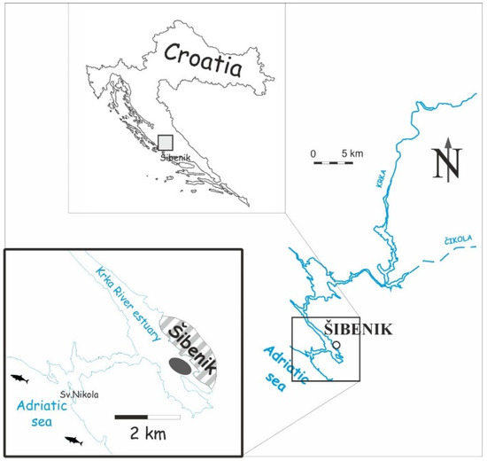The city of Šibenik, located in lower part of the Krka River estuary, has a population of around 31,000 inhabitants [18]. However, due to tourism, especially nautical tourism [19], these numbers multiply during the summer season. The port/harbor of the city includes the transportation of phosphate ore [12], wood, and aluminum. There are also several mussel (Mytilus galloprovincialis) farm plants [20].