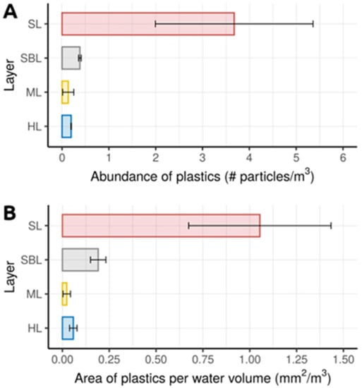 The total observed area of collected particles was 336.21 mm2 overall, with the maximum of 185.23 mm2 found for SBL and the minimum of 11.14 mm2 for ML. Mean observed area of plastics in water volume showed the characteristic exponential decrease with depth in a manner similar to the vertical abundance of particles (Figure 2A,B): the observed area per water volume was the largest in the SL (1.054 mm2/m3), followed by the SBL (0.191 mm2/m3), then (0.058 mm2/m3) in HL, and the smallest in ML (0.023 mm2/m3).