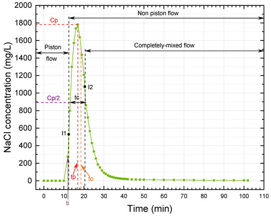 Sodium chloride (NaCl) was used as a tracer substance with instantaneous dosing. NaCl is cheap and easy to acquire and quantify (with a simple conductivity meter), is non-toxic, and presents no risk of environmental pollution or human health consequences [24]. The NaCl concentration was determined by electrical conductivity measurement and correlation with the respective calibration curve. Tracer concentration trend graphs were generated, flow analysis was performed with the Wolf-Resnick method, and the Morrill index was calculated [25]. The conditions for each test are summarised in Table 2.