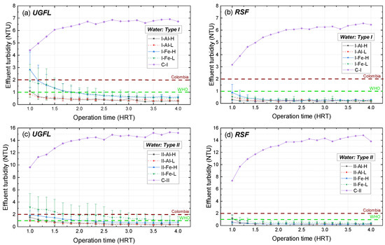 Figure 6 presents the average turbidity results and the error (standard deviations of each test and its replicate) of the UGFL and RSF effluents for the treatments presented in Table 3 and for the operating times evaluated, reported as HRT. This figure includes the variables water type (I and II), coagulant (Al and Fe) and operating flow (L and H).