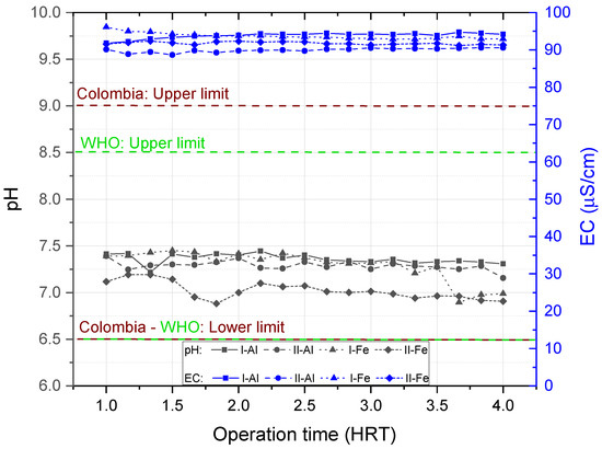 Figure 7 presents the average results for pH and EC in the effluent of the SDWTS system, for both types of water (I and II), with the coagulants PACl (Al) and ferric sulphate (Fe). In this figure, it can be observed that the EC did not present significant variations in the effluent and all the values obtained were lower than the maximum limit (1000 µS/cm) established in the Colombian regulations for drinking water [34]. It can also be observed that the effluent pH for treatments with the coagulant ferric sulphate presented values close to the lower permissible limit established for this parameter in water for human consumption (6.5 to 9.0 pH units). The WHO does not propose any reference value for this parameter because pH levels found in drinking water do not represent a health concern. However, pH is one of the most important operational parameters of water quality. The optimum pH required will vary in different supplies according to the composition of the water and the nature of the construction materials used in the distribution system, but it is usually in the range 6.5–8.5 [35]. In the case of treatments with the coagulant PACl, values closer to neutrality were presented, also complying with Colombian regulations for drinking water [34]. This neutral pH was because the coagulant PACl has basicity (70%) in its chemical composition, implying a lower alkalinity consumption and a lower pH reduction in the treated water compared to the ferric sulphate coagulant [36]. The temperature of the effluent water was also monitored as a control variable, with an average value of 24.6 °C.