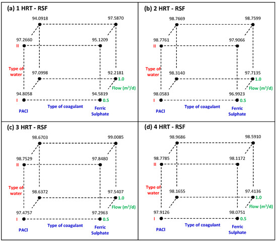 Table 7 presents the standardised effects of the three factors: coagulant (C), type of water (W), flow (F) and Table 8 shows the results of their interactions (C*W, C*F, W*F and C*W*F) on the turbidity removal in the UGFL and RSF for the four SDWTS operating times. Additionally, Figure 8 and Figure 9 present the cube plots for the turbidity removals (adjusted means) with the relationships between the three factors and for UGFL and RSF, respectively.