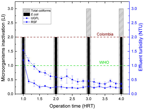 Then, from 1.5 HRT operation time in all treatments, treated water (RSF effluent) with turbidity less than 1.0 NTU was obtained, complying with the recommendations of the WHO [33] and Colombian regulations [34] to promote effective disinfection. In Figure 6, the horizontal dashed lines represent the turbidity limits recommended by WHO and Colombia, respectively.