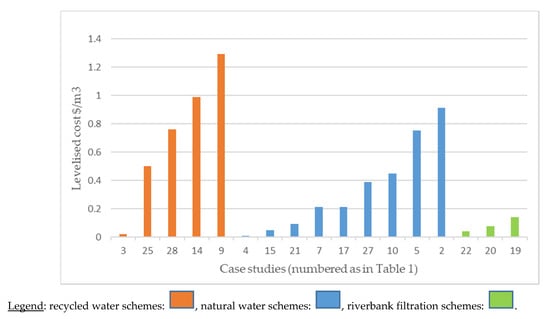 Table 2 shows average annual levelised costs of 18 of the 21 schemes in Table 1 excluding the three reserve supply capacity schemes whose costs are measured differently. These schemes are divided into three categories, recycled water wells and infiltration, natural water wells and infiltration and riverbank filtration. The average levelised cost of five schemes using recycled water—USD 0.74 per m3—is much higher than the average levelised cost of 10 schemes using natural water—USD 0.24 per m3 for wells and infiltration, and USD 0.11 for three schemes using riverbank filtration.