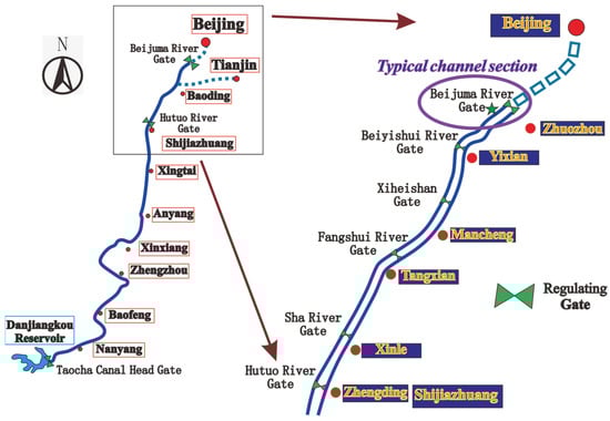 Long-distance water transfer project is an important approach to effectively solve the water shortage problem in large- and medium-sized cities [1]. The total length of the main canal of the Middle Route of the South-to-North Water Transfer Project is 1267 km, as shown in Figure 1. Water is transported from the Danjiangkou Reservoir in the Hanjiang River to the North China Plain [2]. The purpose of this water transfer project is to transfer water to Henan Province, Hebei Province, and the cities of Beijing and Tianjin. The average annual amount of transferred water is 9.5 billion m3 [3]. Since the start of the operation of this water transfer project in 2014, given the strong coupling of cascaded channels, it has been difficult to keep water levels at all gates along the route being stable. The cross-section of the main canal has a trapezoidal shape, with a bottom width range from 7.0 to 26.5 m. Along the water transfer route, there are no lakes or reservoirs for water detention, indicating the importance of safety operation of this project [4]. The main canal of this water transfer line is spanned from the place located at the north latitude of 33° to the north latitude of 40°. During winter periods, the temperature in northern China such as in Beijing is generally low. As a consequence, the formation of ice cover in the water transfer cannel creates a big ice problem [5].