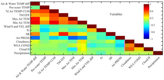 By taking the thermal and dynamic factors that affect the change of temperature of water body as the input features, an SVM-based discriminant model for water heat balance is established to assess the heat loss and heat gain of water body. In this study, data were obtained through on-site observations. Among them, the observed data for water flow conditions at some cross-sections near the control gate have been acquired from the management department of the MR-SNWTP. The temperature sensor and flow velocity meter have been used to collect data for describing water flow conditions, which were measured 4 times every day. The meteorological data were acquired from the meteorological station which was setup by considering the locations for observations of the water flow. The number of daily measurements of meteorological data is consistent with that of for water flow. The daily average approach is adopted to form a dataset for subsequent analysis. These environmental variables have different effects on the latent heat flux and the sensible heat flux, which are correlated to the heat balance. The correlation analysis of each characteristic data has been carried out, and the correlation matrix of the measured dataset is established. The calculated correlation coefficient is presented in Figure 2. The corresponding thermal factors and dynamic factors are abbreviated to better express the figure. These factors include: the temperature difference between air and water (Air and Water TEMP diff), the previous water temperature (Pre-water TEMP), the cumulated seven-day average daily air temperature (7d Air TEMP CUM), the time effect (TM EFF), the maximum air temperature (Max Air TEMP), the minimum air temperature (Min Air TEMP), the difference between wind speed and water velocity (Wind S and VEL diff), the flow Froude number of water flow (Fr), the solar radiation (SR), the air pressure (Air PRESS), the cloudiness (Cloudiness), the weather conditions (WEA COND), the cloud height (Cloud H), and the precipitation (Precipitation).