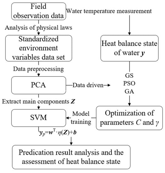 According to the cumulative contribution rate of each principal component in Table 2, results showed that the result for the first two principal components can explain more than 50% of the information for original data; the information for the first five principal components can explain more than 80% of the information for original data; the information for the first seven principal components can explain more than 90% of the information for original data. With respect to the prediction of water temperature and heat balance state, based on the data measured at the typical survey section during six winters from 2015 to 2021, the measured data from 2015 to 2020 are used as the training samples to establish the model and optimize the model parameters, but the measured data from 2020 to 2021 are used as the verification samples to test the capacity for generalization of the model. The flow chart for calculation for the assessment of heat balance state is shown in Figure 4.