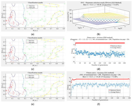 (a) the PCA-GS-SVM classification; (b) parameter optimization using the GS method; (c) the PCA-PSO-SVM classification; (d) the fitness curve of the PSO algorithm; (e) the PCA-GA-SVM classification; (f) the fitness curve of the GA algorithm.
