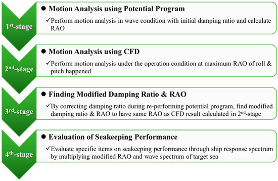 Kim et al. [15] proposed an alternative simulation model that maximizes the advantages of potential analysis and CFD simulations and establishes an evaluation procedure for the seakeeping performance of small vessels. The motion RAO solved using potential analysis is calculated when a vessel is operating at a constant speed in waves and corrects the damping ratio of the final motion through the RAO obtained by performing a CFD simulation at the frequency corresponding to the maximum response (i.e., the maximum value of the ship response spectrum calculated by multiplying the square of the RAO by the wave spectrum). However, the maximum value of the ship response spectrum may vary depending on the wave spectrum at the target sea site, and it may be difficult to exclude some ambiguities, such as the occurrence of multiple peaks in the ship response spectrum. Consequently, the results may differ if the damping ratio of the final motion is derived based on the maximum value of the ship response spectrum. Moreover, the reliability of the results was not verified experimentally.