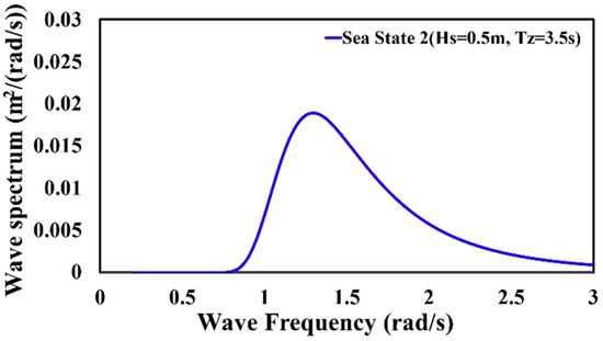 The Texel–Marsen–Arsloe (TMA) spectrum [18] was used as the wave spectrum, and Suh et al. [19] reported an example of statistically analyzing the appropriate spectrum by examining the wave height and period data of a coast in South Korea. Please refer to Appendix A for a brief introduction to the TMA spectrum and the equation used to calculate it. Figure 5 shows the calculated TMA spectrum of an actual sea site.