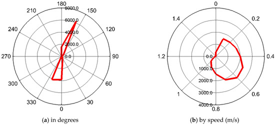 We collected 17,522 samples of current data generated in 2019 at 30-min intervals. Figure 6 shows the occurrence of the current in terms of direction and speed and red line shows the number of occurrences. As shown in the figure, the current at the target sea site occurs in an approximately straight line. To minimize hull roll, which has the most significant impact on the hull’s stability, the head sea of the barge was assumed to be 157.5°, which is the direction in which the current occurs most frequently. Currents mainly occurred between the speeds of 0.1 m/s and 1.1 m/s, and large currents of 1.2 m/s or higher did not occur on average.