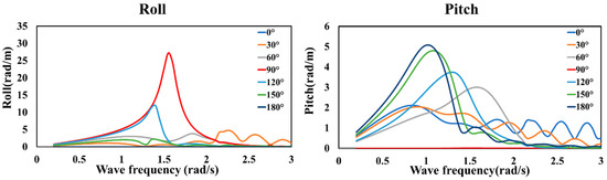 Figure 9 shows the initial RAO of the roll and pitch in each wave direction with an initial roll-damping ratio of 0.05. For roll, the largest motion occurs in a wave direction of 90°, and the corresponding natural frequency is 1.5 rad/s. For pitch, the largest RAO was observed at a frequency of 1.0 rad/s and a wave direction of 180°.