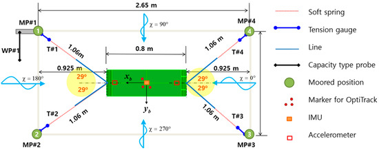 Experiments were conducted in an experimental wave tank (EWT) at Changwon National University, South Korea, which was 20 m long, 14 m wide, and had a water depth of 19.5 m. A 1/49 scale model ship is installed in a state that allows free 6-DOF motion by applying a soft mooring spring. After installing the tension gauges at the four angle points, the tension gauges, mooring lines, and springs were connected to the model ship. Figure 15 depicts a schematic of the model installation with sensors, soft mooring, and dimensions. An optics-based system (V120:TRIO, OptiTrack, Corvallis, OR, USA) and inertial measurement unit (IMU) sensors were used in this experiment to measure 6-DOF motion.