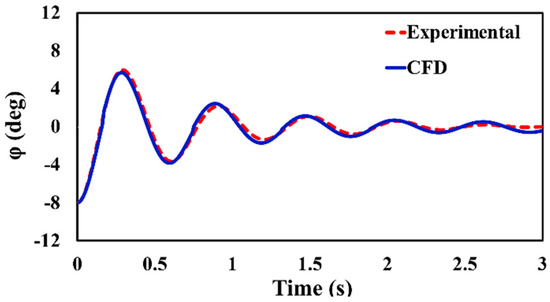 - CFD reliability from roll decay test:The damping ratio derived from the free roll decay model test was 0.1197, and the roll damping ratio derived from CFD was 0.1277, which exhibited a relative error of approximately 6.6%. This CFD simulation result was very close to the experimental value, thereby verifying the accuracy and reliability of the CFD used in the CMP model process.