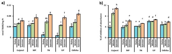 Oxidative stress was determined from the LPx level. The lipid peroxidation level was found to be the highest during the summer season for snails collected from all the locations (Figure 1a). There was a 0.5 to 8 times lower LPx value observed during the rainy season as compared to the summer season. The lowest LPx level was observed in the foot muscle of snails collected from UP and TN during the rainy season as compared to the other sampling sites. The total antioxidant capacity was detected to be the highest during the summer season and was the highest at the Gujurat sampling site as compared to the other sampling sites. The trend of the variation of this parameter was summer > winter > rainy season (Figure 1b). The DPPH scavenging capacity was found to be lowest during the rainy season, being 64% lower than in the summer season (Figure 1b). Out of all the states, snails collected from Gujarat and TN showed the highest and lowest total antioxidant activities, respectively.