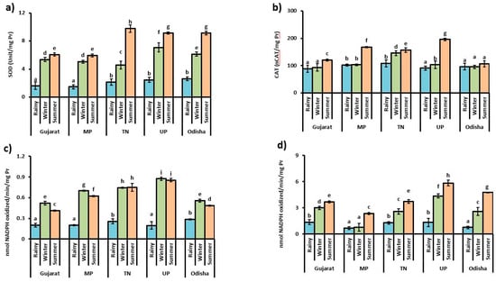 The lowest SOD activity was observed during the rainy season, while its activity was the highest during the summer season as compared to the other two seasons (Figure 2a). The SOD activity was 300–400% elevated during summer than during the rainy season. Spatially, the highest and lowest SOD activity was observed in snails collected from TN and MP, respectively, as compared to the other sampling sites (Figure 2a). A surge in CAT activity was recorded during the summer season as compared to the other two seasons. The highest CAT activity was found during the summer season, having 25–110% more activity as compared to the other two seasons. Similarly, out of all the locations, the highest CAT activity was observed in snails sampled from UP while the lowest was found in the Odisha sampling site as compared to the other two sites (Figure 2b). The higher GPx activity was observed during the winter season as compared to the other seasons in snails. The lowest GPx activity was found during the rainy season, having 64 to 73% less activity in comparison to the other two seasons (Figure 2c). The highest and lowest activity of this antioxidant enzyme was observed in snails sampled from the UP and Gujarat regions, respectively. The highest GR activity was observed during the summer season while the lowest activity was found in the rainy season (57% less activity) in snails as compared to the other sampling sites (Figure 2d). Spatially, snails sampled from UP were observed to have the highest GR activity while those of MP had the lowest activity as compared to the other sampling sites. The total antioxidant activity was found to be elevated during the summer season in comparison to the other two seasons.