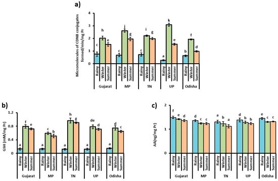 The activity of the GST enzyme was observed to be elevated during the winter season, with a 233% augmentation than in the rainy season (Figure 3a). A moderate level of GST activity was found during the summer season as compared to the other two seasons. Spatially, the highest and lowest activity of this antioxidant enzyme was observed in the snails sampled from the UP and Odisha states, respectively (Figure 3a). The -SH group was 75 to 83.33% decreased during the rainy season compared to the winter season (Figure 3b). The non-protein -SH level was found to be the highest in snails collected from TN while that of MP had the lowest concentration as compared to the other sampling sites. Similarly, the AA content was observed to be the lowest during the summer season as compared to the other seasons (Figure 3c). The AA level was 8.5 to 10.5% alleviated during the summer season compared to the other two seasons. The highest AA content was recorded in snails sampled from the Gujarat region as compared to all the other locations.