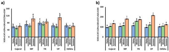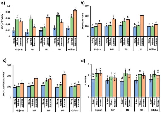 The generation of H2O2 and the rate of its neutralization by CAT and GPx enzymes was determined by the SOD/CAT+GPx value. The much lower value of SOD/CAT+GPx was observed during the rainy season in comparison to the other two seasons (Figure 4a). SOD+CAT+GPx value was found to be higher during summer than the other two seasons (Figure 4b). Higher SOD+CAT+GPx+GR+GST was detected during the summer season (Figure 4c). The AA+GSH value was also recorded as the lowest during the rainy season while insignificant variation was observed between the winter and summer seasons (Figure 4d). The SOD+CAT+GPx+GR+GST/AA+GSH value was found to be lowest during the winter season (Figure 5a). Similarly, the highest and lowest SOD+CAT+GPx+GR+GST+AA+GSH values were detected during the summer and rainy seasons, respectively (Figure 5b).