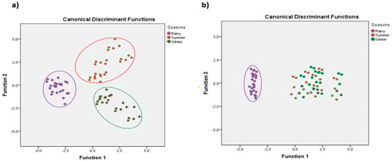 Discriminant function analysis for the antioxidant molecules of P. globosa. Discriminant function analysis for (a) antioxidant enzymes and (b) small antioxidant molecules were determined, which were divided into three groups among the rainy, winter and summer seasons.