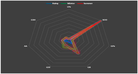 Radar chart of the seasonal variation of the antioxidant levels of P. globosa. Radar chart of antioxidant molecule levels in different seasons suggests the distinct impact of season on the SOD and GR levels.