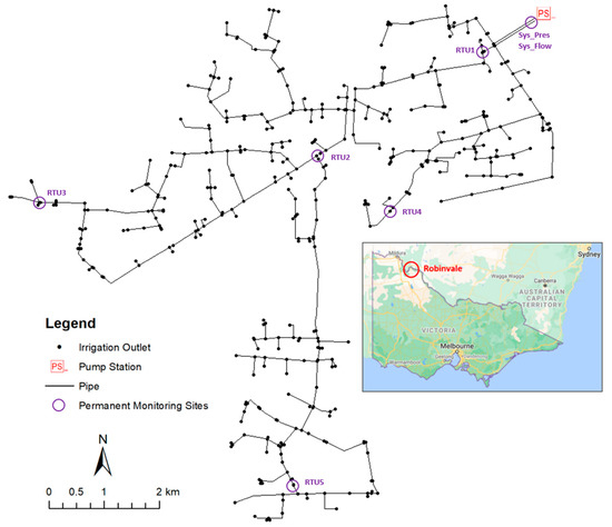 In the Robinvale irrigation system, each irrigation outlet has a flow meter installed, with the real-time irrigation flow data monitored remotely using a SCADA system. Therefore, each outlet has a unique irrigation demand pattern during the calibration period. As shown in Figure 2 above, there are six permanent pressure sensors installed in the system, with one (Sys_Pres) located just out of the pump station and the other five (RTU1 to 5) across the network. In addition, a permanent flow meter (Sys_Flow) was installed on each of the two rising mains out of the pump station, measuring the total flow into the system. In addition, the pressure sensor accuracy is ±0.2% (approximately ±3.2 kPa).
