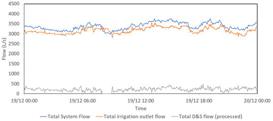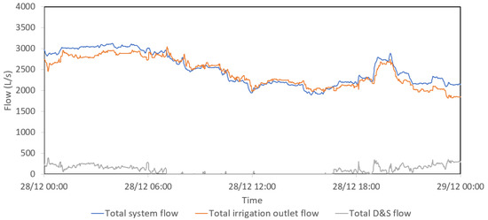 Data collection over an extended period is suggested in the WDS model calibration process to improve the model accuracy [29]. Additionally, the measured data is considered to be satisfactory when the error in the measurement of head loss is considerably smaller than the head loss itself [32,67]. Therefore, it is highly recommended to collect calibration and validation data during periods with peak demands [2,15,63,67,68,69] when the head loss is considered to be more sensitive to the variation in pipe roughness values. In addition, monitoring data availability and quality should also be taken into account for data selection. In this paper, 28 December 2019 has been selected as the calibration period, considering the high demand and the good quality of both flow and pressure data. The model validation period was selected as 19 December 2019 as one of the days that have the highest irrigation water demands, with the second-best quality pressure and flow data.