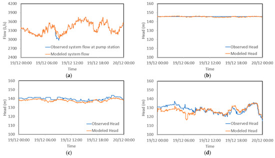 Once a WDS hydraulic model has been calibrated, it is highly recommended to verify the accuracy through a model validation process by comparing modeled results with field-observed data from a different period of time [15,63]. Model validation is also an important step to verify the reliability of the calibration process and validate the model performance, which is not always considered in past calibration studies. In this paper, independent validation data has been selected to perform model validation.