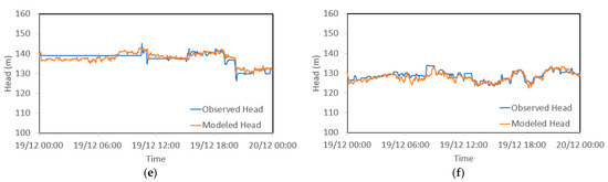 In addition, optimized pipe roughness values obtained from Formulation 2 (4 DVs with the SLSQP method) have been selected as input into the hydraulic model to calculate the model-simulated results which are to be compared with field observations. The minimum average of the five RMSE values from the five pressure sensor locations is calculated to be 1.709 m. The field-observed HGL versus the model-predicted values at two pressure monitoring sites (RTU 1 and RTU 5) as two examples are shown in Figure 6 below. In general, a good match between the modeled and the observed values of each site has been achieved. Full results of the breakdown and comparison of the measured and modeled values at each monitoring site are provided in Table S3 and Figure S1 in the Supplementary Material.