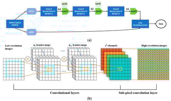 The framework of ESPCN: (a) the layers of the ESPCN used in our experiment; (b) the convolutional part and the sub-pixel convolution part of the network.