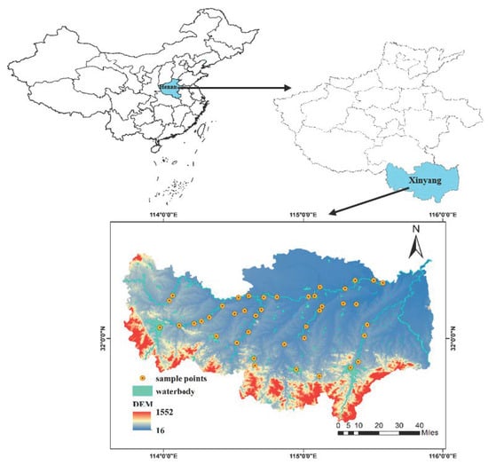 The study area is 113°45′ E~115°55′ E, 30°23′ N~32°27′ N in the Xinyang section of Huaihe River Basin. The study area is located on the boundary line between North and South China (Qinling–Huaihe Line), which belongs to the transition zone between subtropical and temperate monsoon climates and the transition zone between humid and semi-humid regions. The main tributaries in the region are shown in Figure 2.