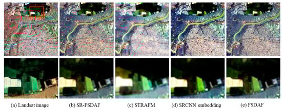 From the fusion result images, STARFM, SRCNN-embedded model, FSDAF, and SR-FSDAF have obtained similar fusion results with the true Landsat image. The SRCNN-embedded method is similar to the SR-FSDAF, and SRCNN is used instead of TPS for upsampling. Through the partial detail comparison, SR-FSDAF retains more details of the roof.