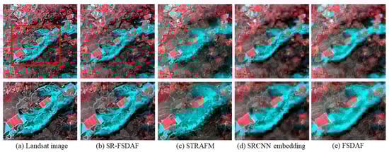 Twelve bands of Landsat-8 (B2, B3, B4, B5, B6, and B7) and MODIS (B3, B4, B1, B2, B6, and B7) were put into the SR-FSDAF model to obtain the fusion image of the predicted date. The fusion results of the first kind of non-heterogeneous mutation are shown in Figure 4. From the perspective of subjective vision, the SR-FSDAF can capture and retain details of the local better.