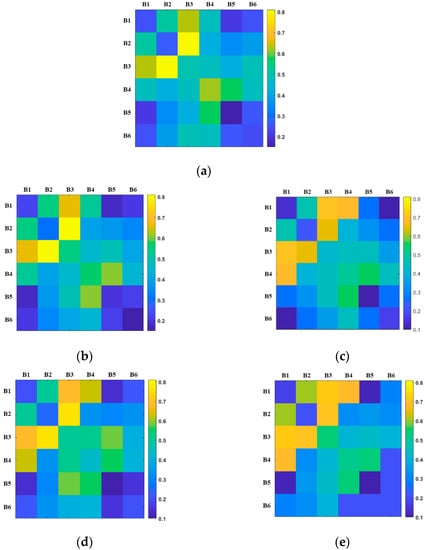 Table 4 shows the specific calculated values of RMSE, SSIM, and SAM of the four methods in Figure 5. The best fusion result values of each band are highlighted by thick lines. The optimal value of SAM is 3.417 of SR-FSDAF, indicating that the fused image of SR-FSDAF has the maximum relative spectral fidelity.
