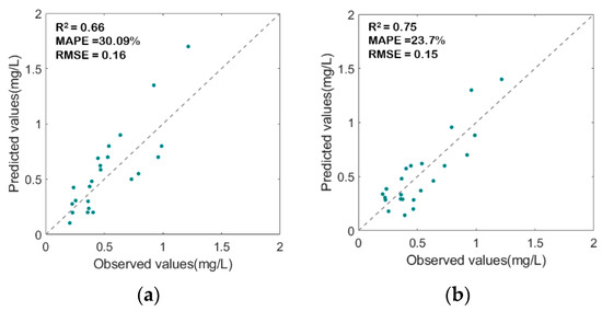 Accuracy assessment results of NH3-N estimated by the statistical regression models and random forest model using SR-FSDAF fused images. The X-axis is the observed data, and the Y-axis is the predicted data. (a) used the statistical regression models (quadratic model); (b) used random forest model.