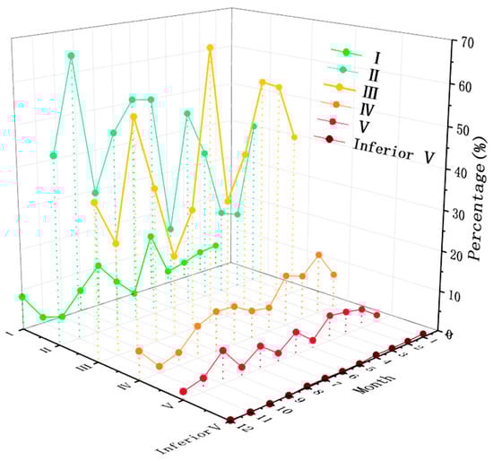 Figure 8 shows the percentage of water surface area of different NH3-N concentration levels in twelve months. According to the relevant survey data, the Huaihe River system is a wet season from July to August, a dry season from December to February, and a water-stable season in other months. The changes in NH3-N concentrations in different periods and the classification standard for NH3-N concentration are shown in Table 7. Figure 9 shows our classification of NH3-N concentrations and the distribution of NH3-N in January 2017.