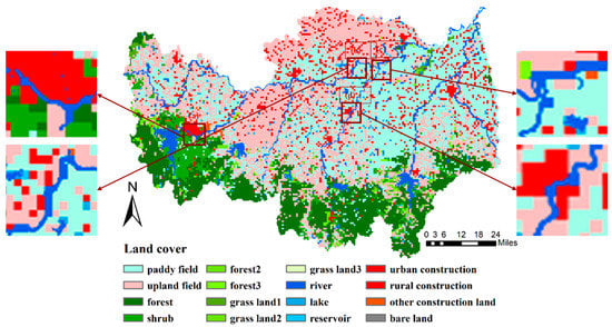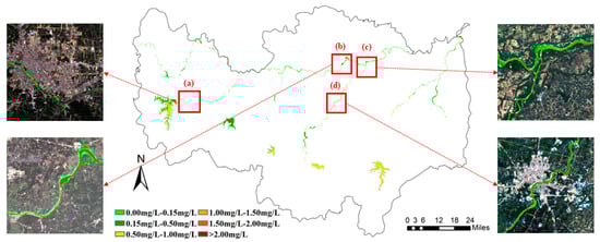 The change in water quality is closely related to the evolution of the surrounding environment. NH3-N is an essential fertilizer for crop growth and a common component in industrial and domestic sewage. The concentration of NH3-N in water is often affected by sewage discharge from human production and life and drugs and fertilizers used in agricultural activities. To further analyze the temporal and spatial variation characteristics of water quality in Xinyang City, we selected four regions (Figure 9a–d). According to the 1 km-land use classification map of Xinyang City in 2017 (Figure 10) and field survey, region (a) is the main industrial region. (b) and (c) are farmland on both sides of the river, mainly dry and paddy fields. The river in (d) passes through residential areas.