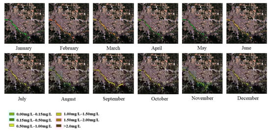 In Figure 11, the river mainly flows through industrial production areas, where NH3-N concentrations are highest in February, March, September, and October. NH3-N concentration was low in January, May, August, and November. The NH3-N concentration in this area did not show obvious seasonal variation and was mainly affected by industrial wastewater discharge.