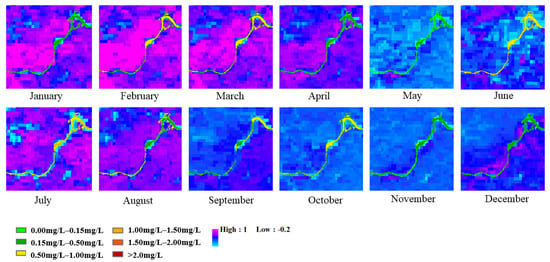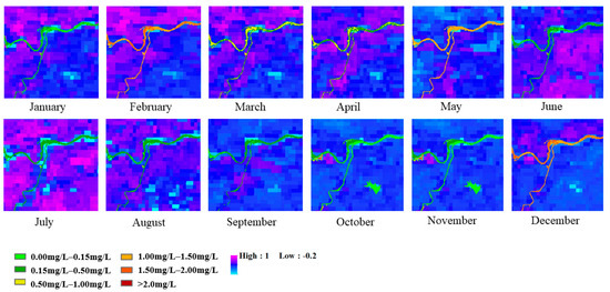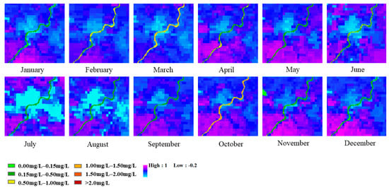 Figure 11, Figure 12, Figure 13 and Figure 14 show the monthly NH3-N concentration changes in the four regions. Figure 12, Figure 13 and Figure 14 contain more farmland, so we compare the NH3-N concentration and NDVI results to verify its relationship with agricultural activities. According to the subtropical and temperate monsoon climate in the same period of rain and heat in Xinyang City, if there is no interference from human activities, the change of NH3-N concentration is mainly affected by the amount of river water, which is higher in December to February and lower in June to August.