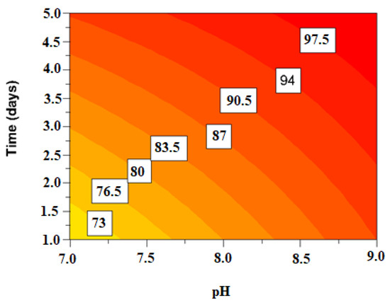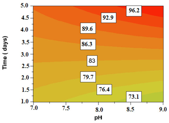 Response surface for the bioremediation process optimization in the function of the variables pH and treatment time with the bacteria without biofilms (the values on the figure indicate the removal achieved in terms of a percentage).